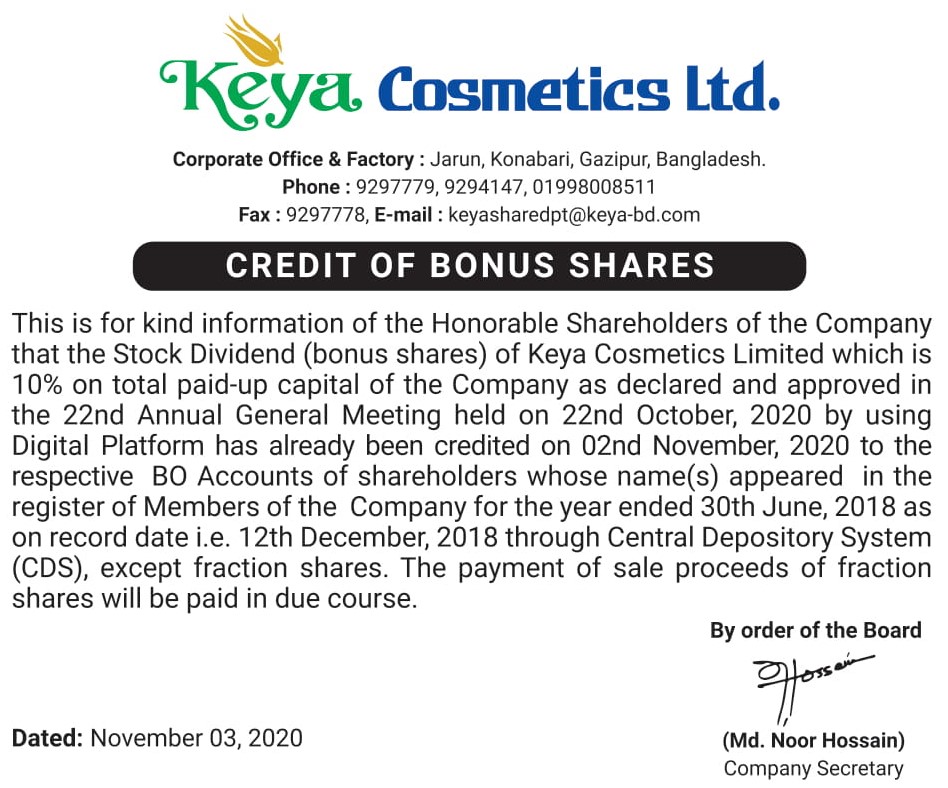 Credit Of Bonus Shares Of Keya Cosmetics Limited