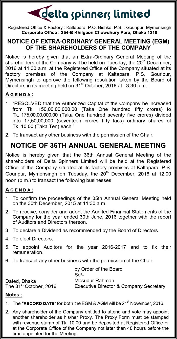 Delta Spinners Ltd Annual Report and EGM Notice 2016