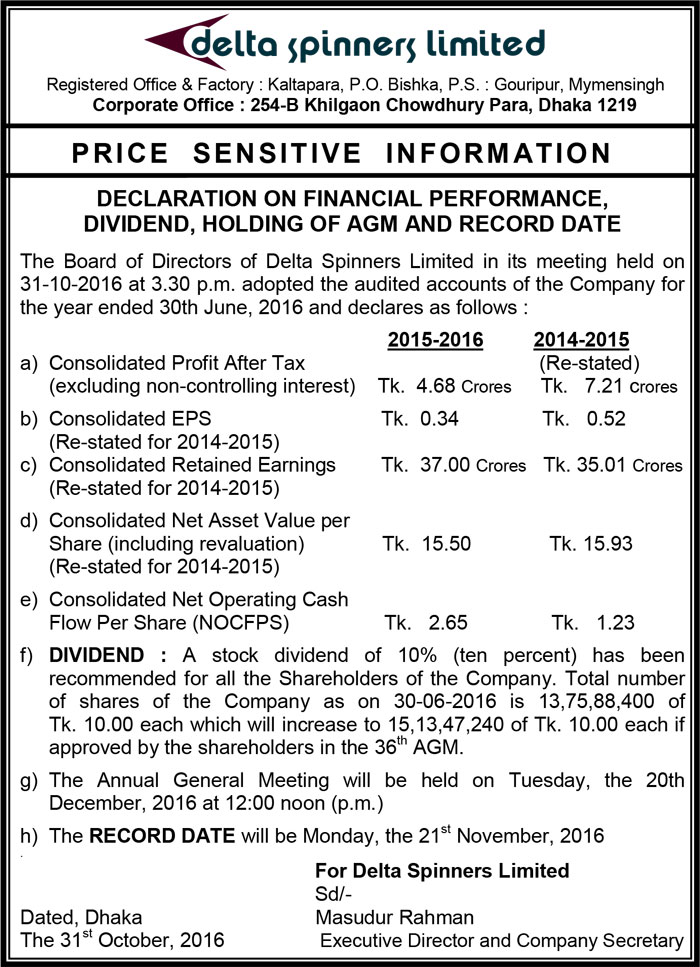 Delta Spinners Ltd 1Q Financial Statements 2016
