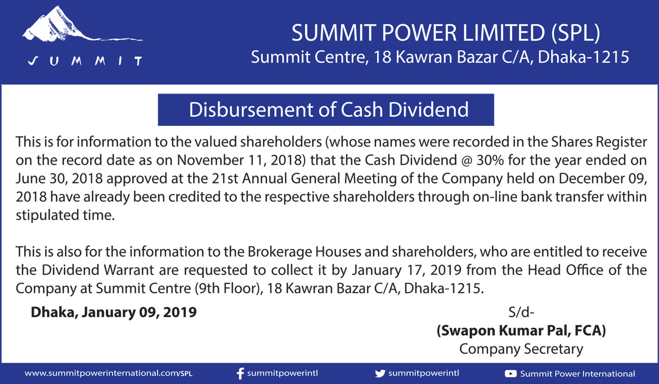 Disbursement of Cash Dividend of Summit Power Limited