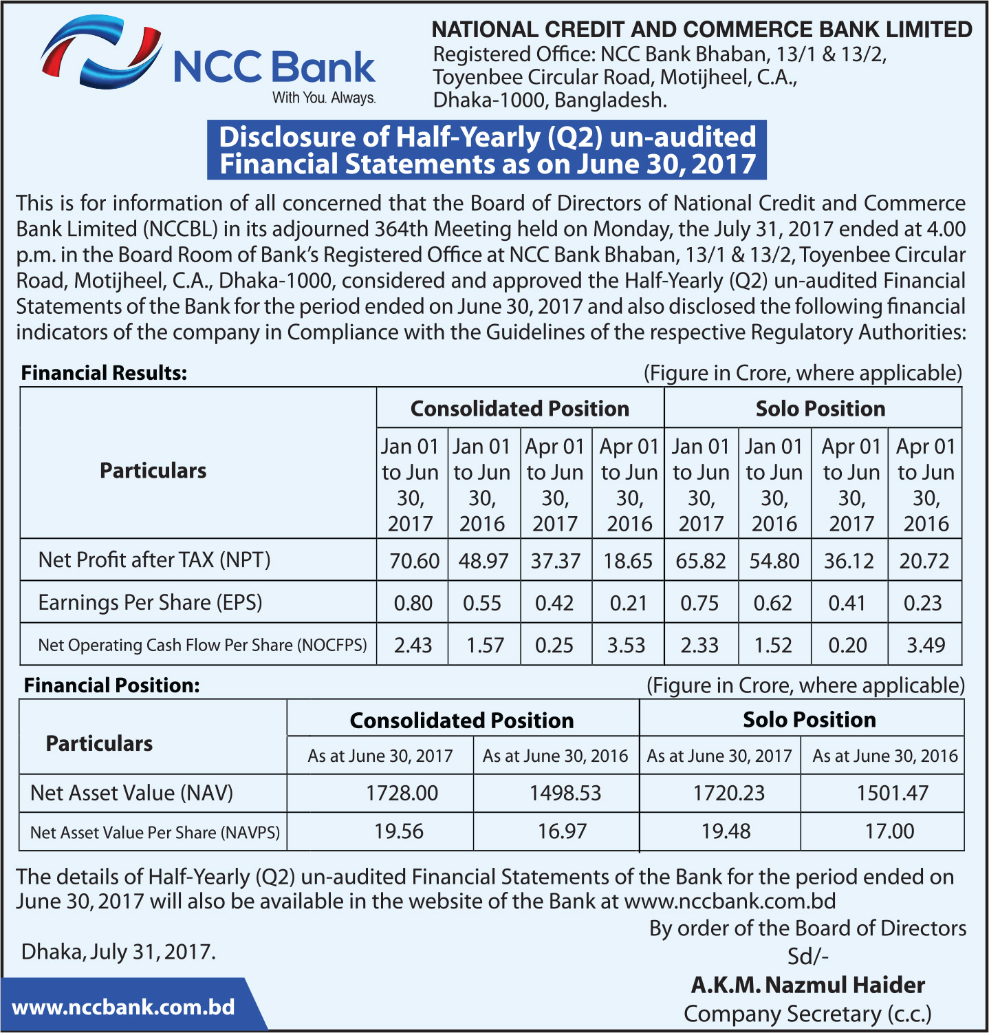 Disclosure of 2Q Un-audited Financial Statements of NCC Bank