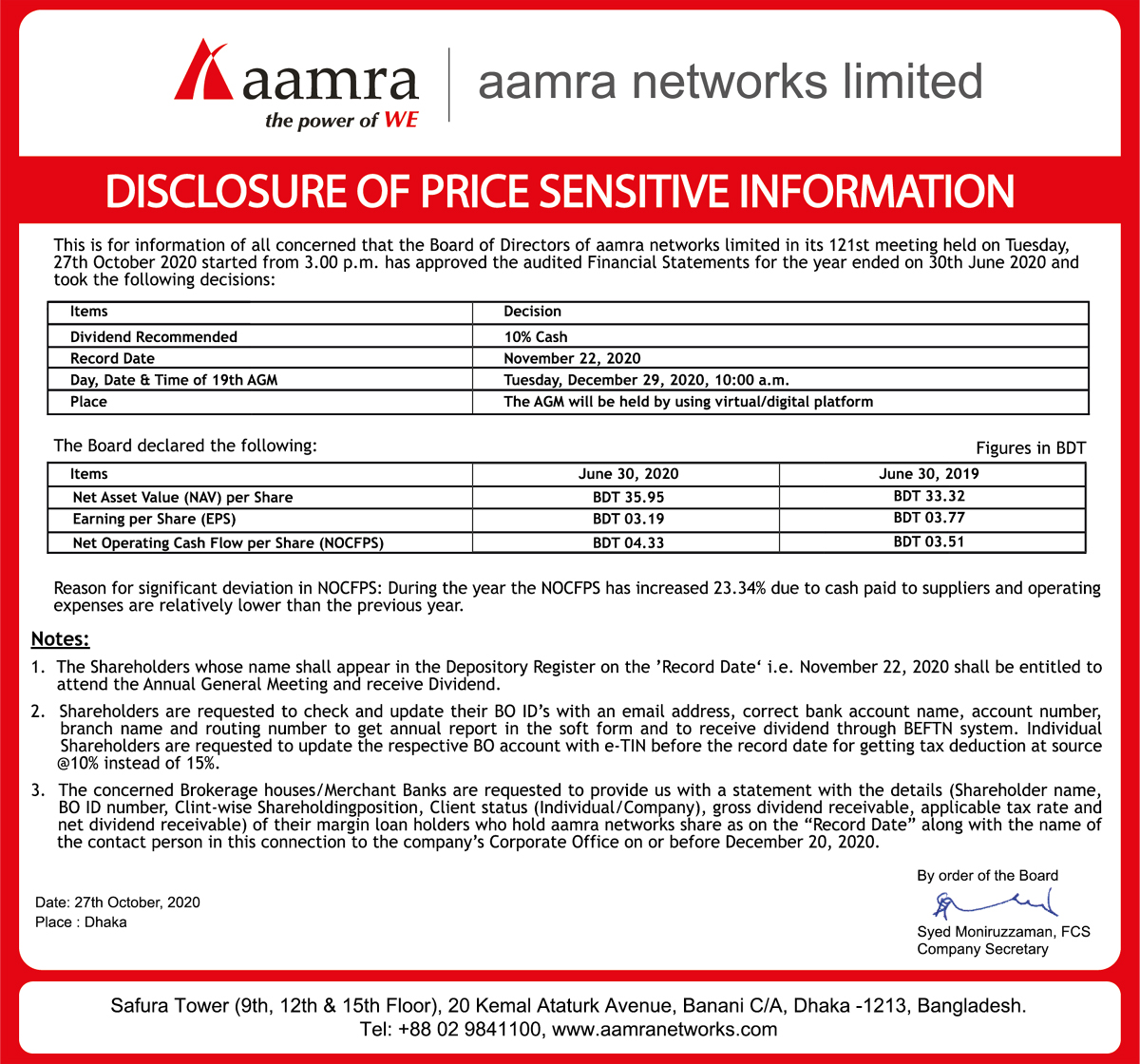 Price Sensitive Information of Aamra Networks Limited
