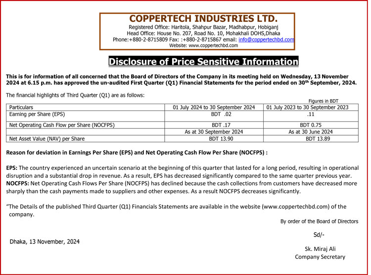 Disclosure of Price Sensitive Information of Coppertech Industries Limited