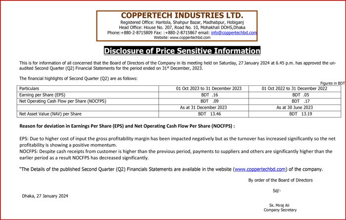 Disclosure of Price Sensitive Information of Coppertech Industries Limited