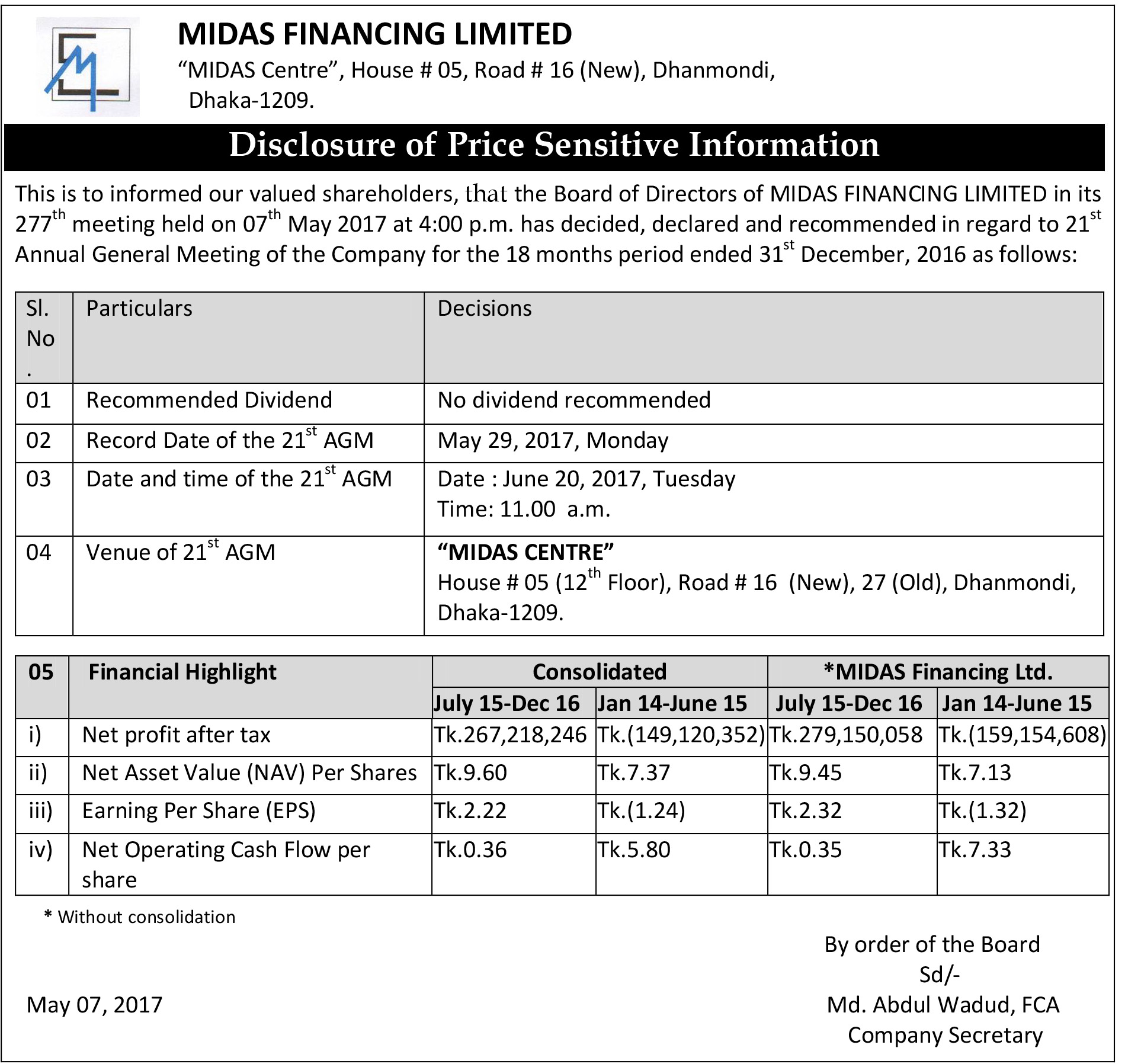 Disclousre of Price Sensitive Information of MIDAS Financing Ltd