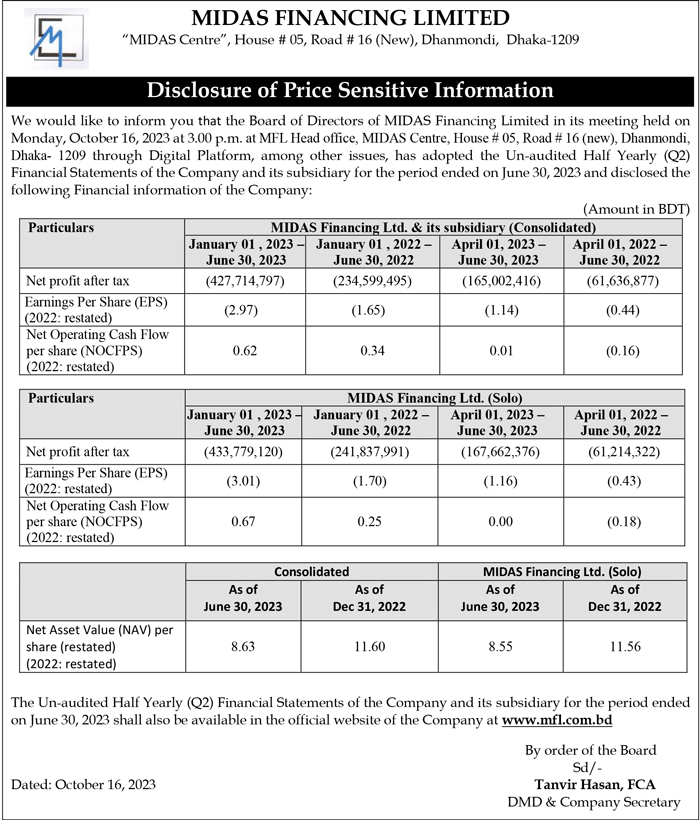 Disclosure of Price Sensitive Information of MIDAS Financing Ltd