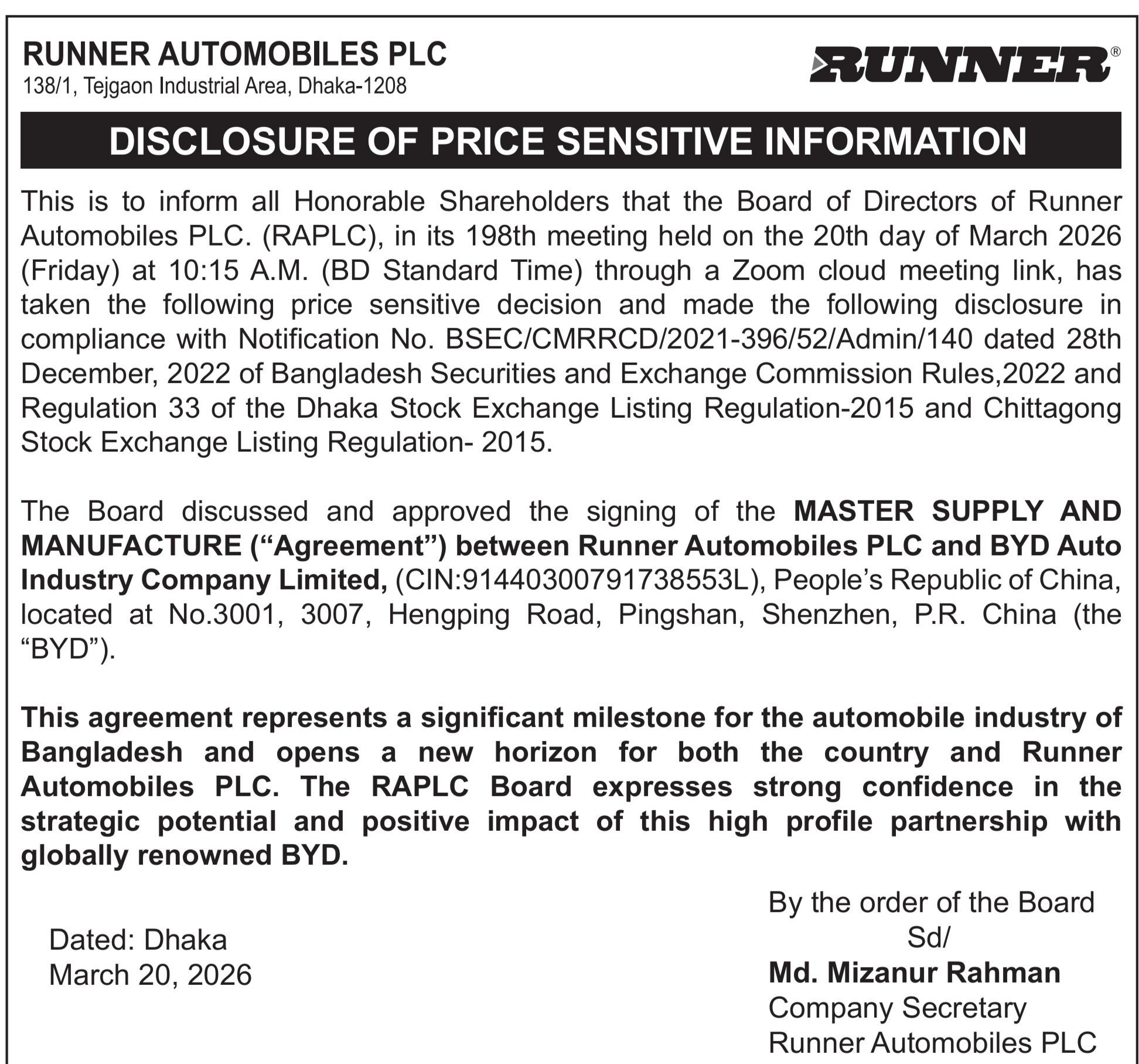 Disclosure of Price Sensitive Information of Runner Automobiles PLC.