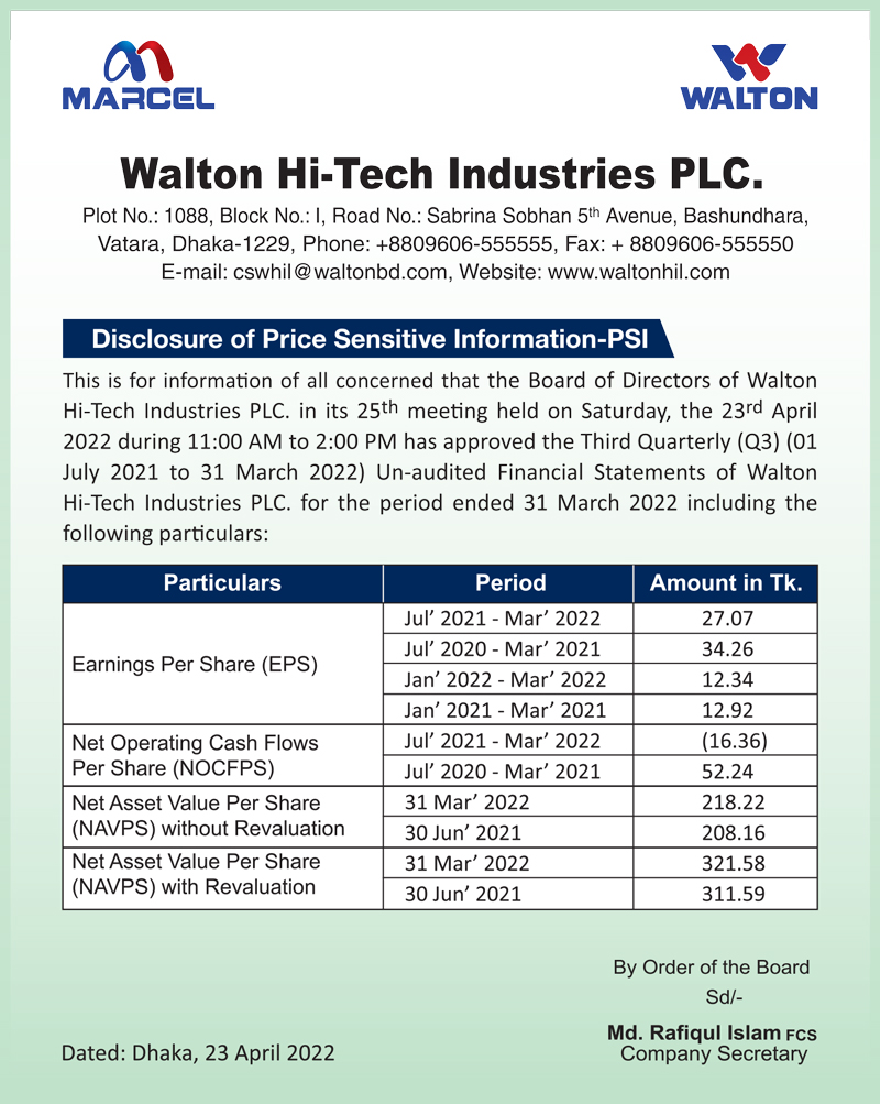 Disclosure of Price Sensitive Information of Walton Hi-Tech Industries PLC