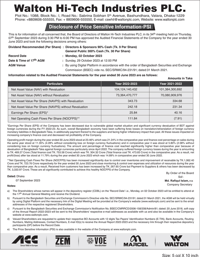 Notification for General Shareholders of Walton Hi-Tech Industries PLC.