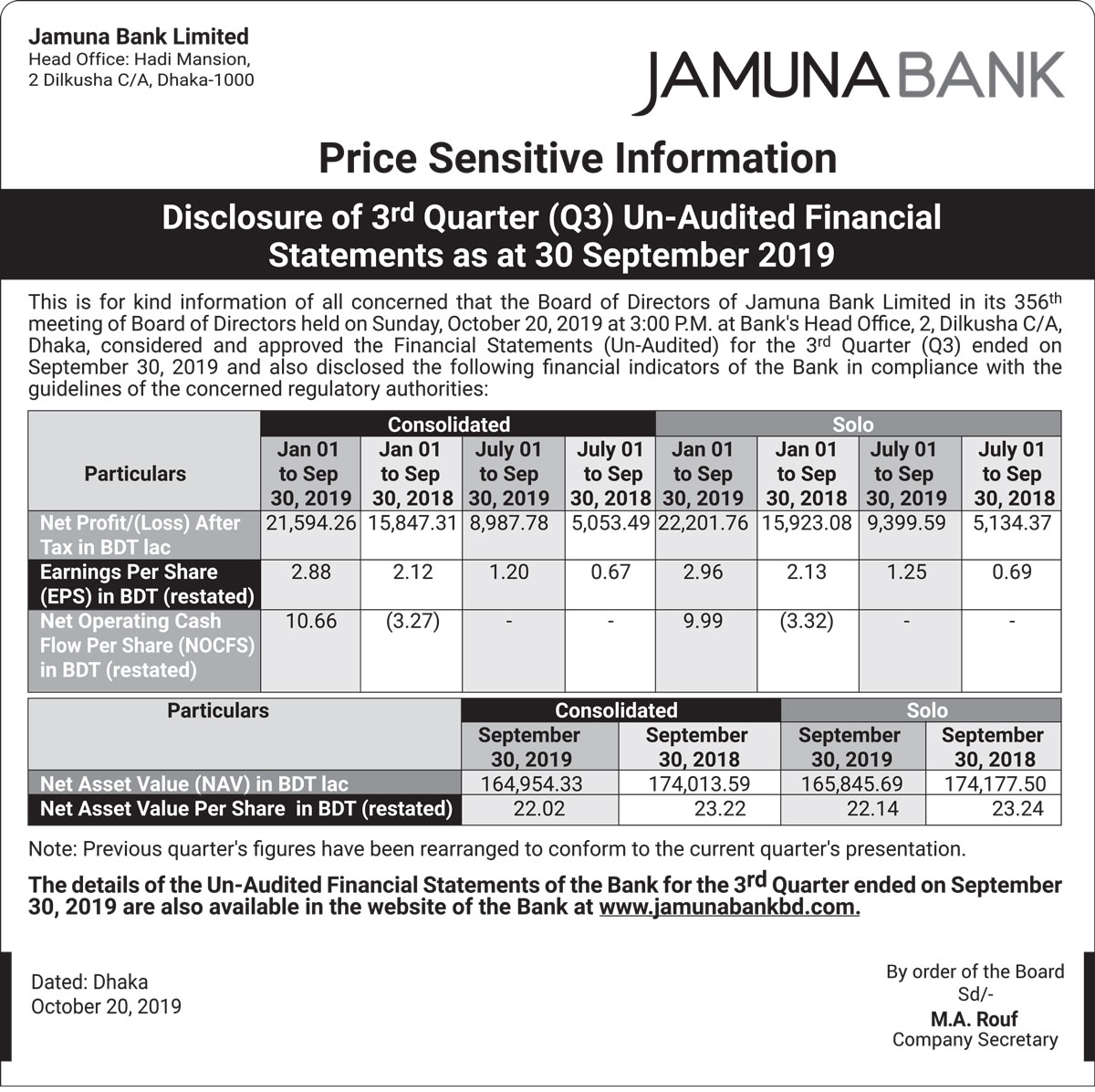 Disclosure of Q3 Un-audited Financial Statements of Jamuna Bank