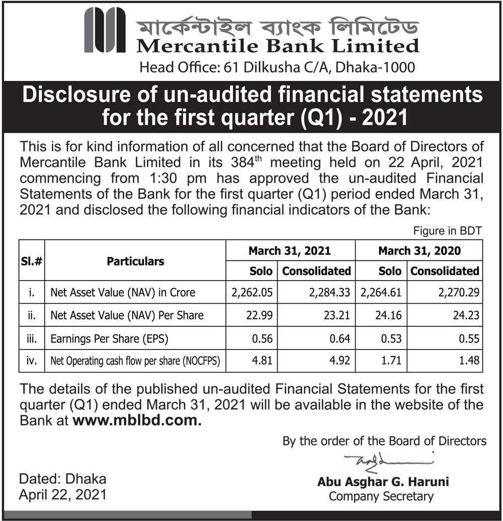 Disclosure of Un-audited Financial Statements for Q1 of Mercantile Bank Limited.