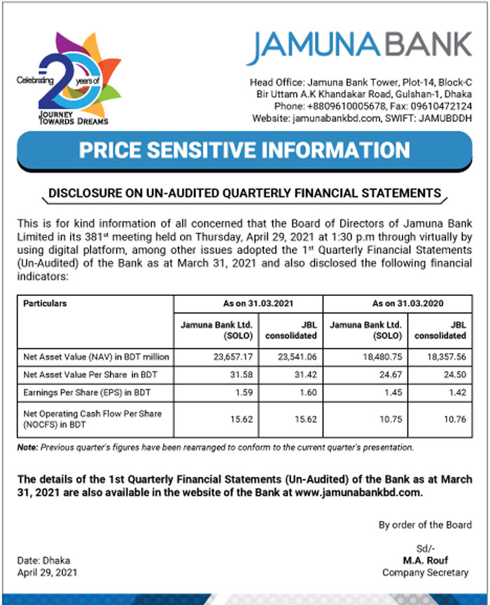 Disclosure on Un-audited Quarterly Financial Statements of Jamuna Bank Limited