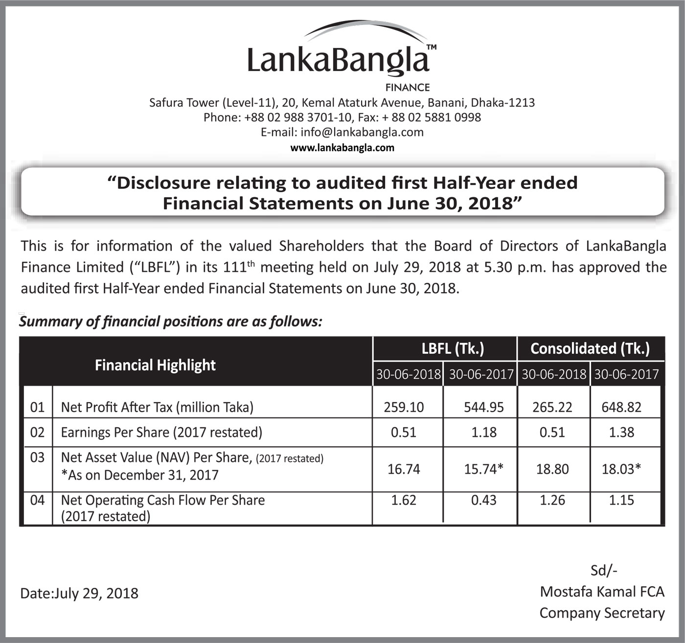 Disclosure relatin to un-audited Half Yearly Financial Statements of LankaBangla Finance ltd