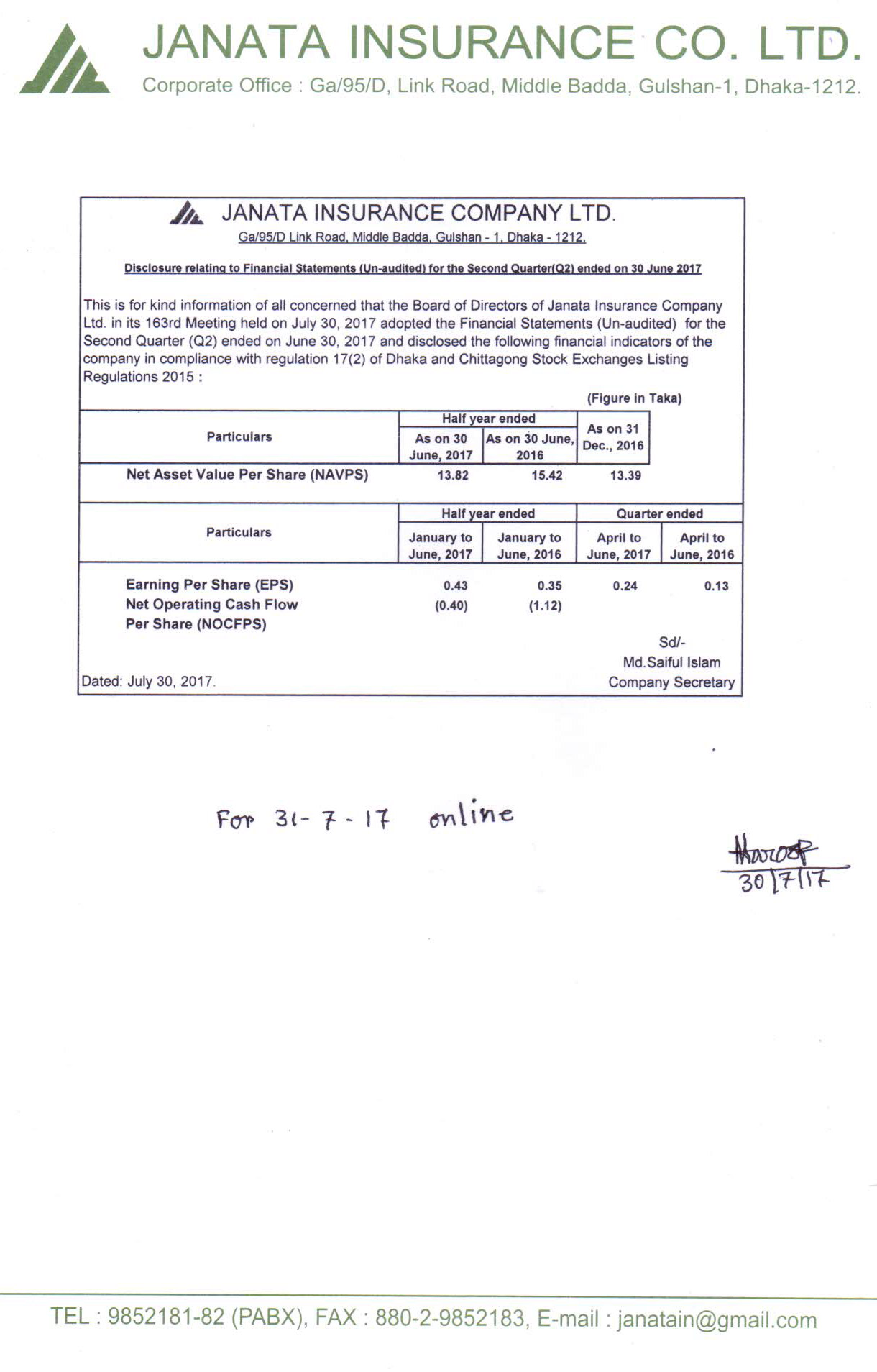 Q2 Un-audited Financial Statements of Janata Insurance Company Ltd.