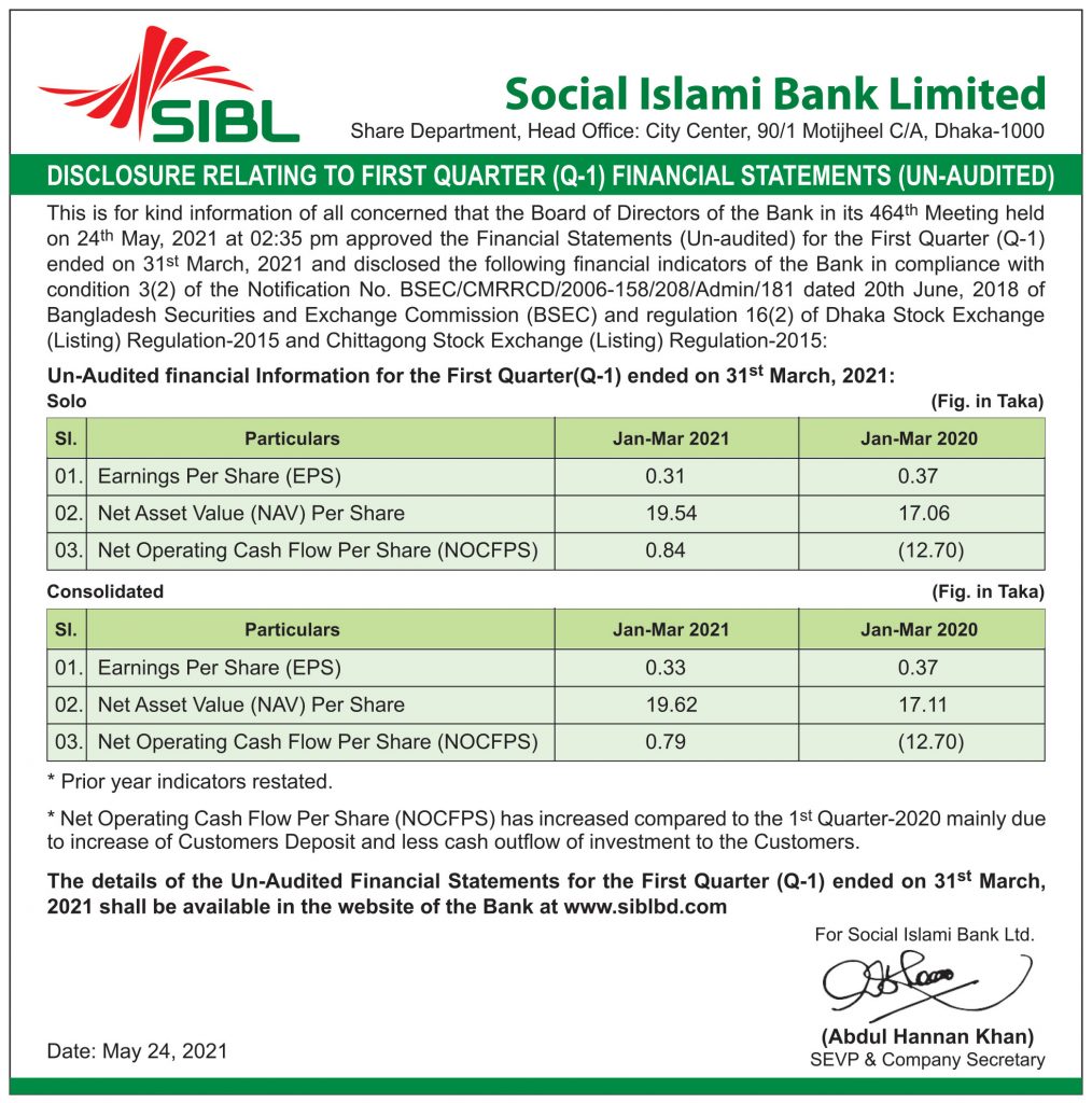Disclosure Relating To First Quarter (Q1) Financial Statements (Un-Audited) Of SOCIAL ISLAMI BANK LIMITED
