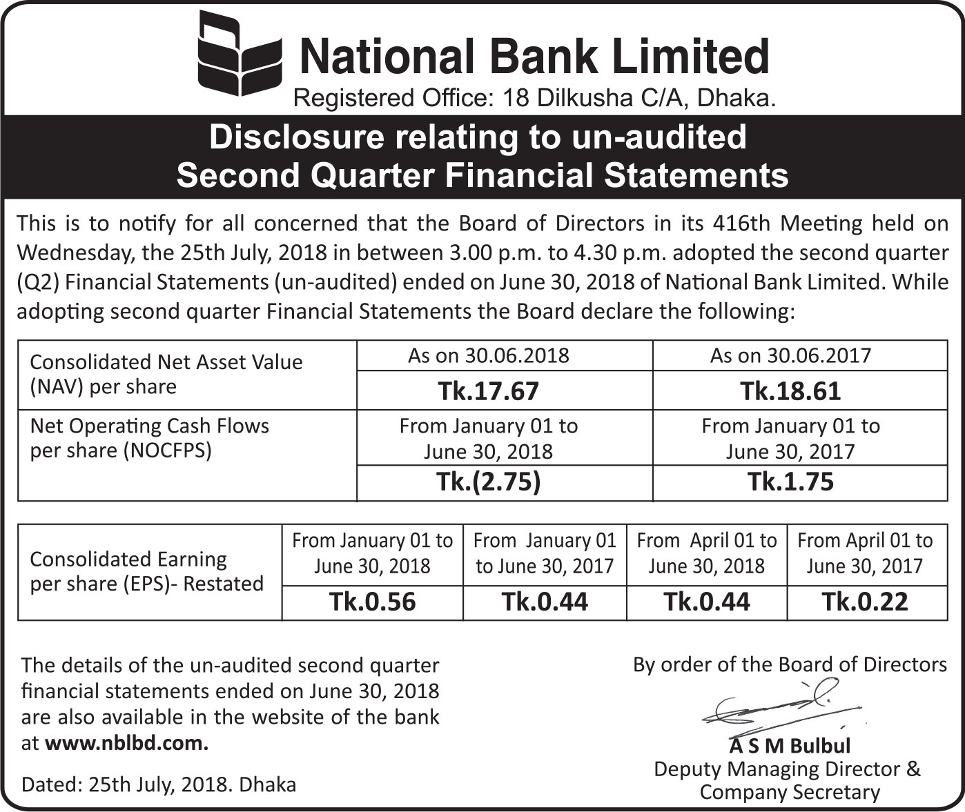 Disclosure Relating to Un-audited Q2 Financial Statements of National Bank limited
