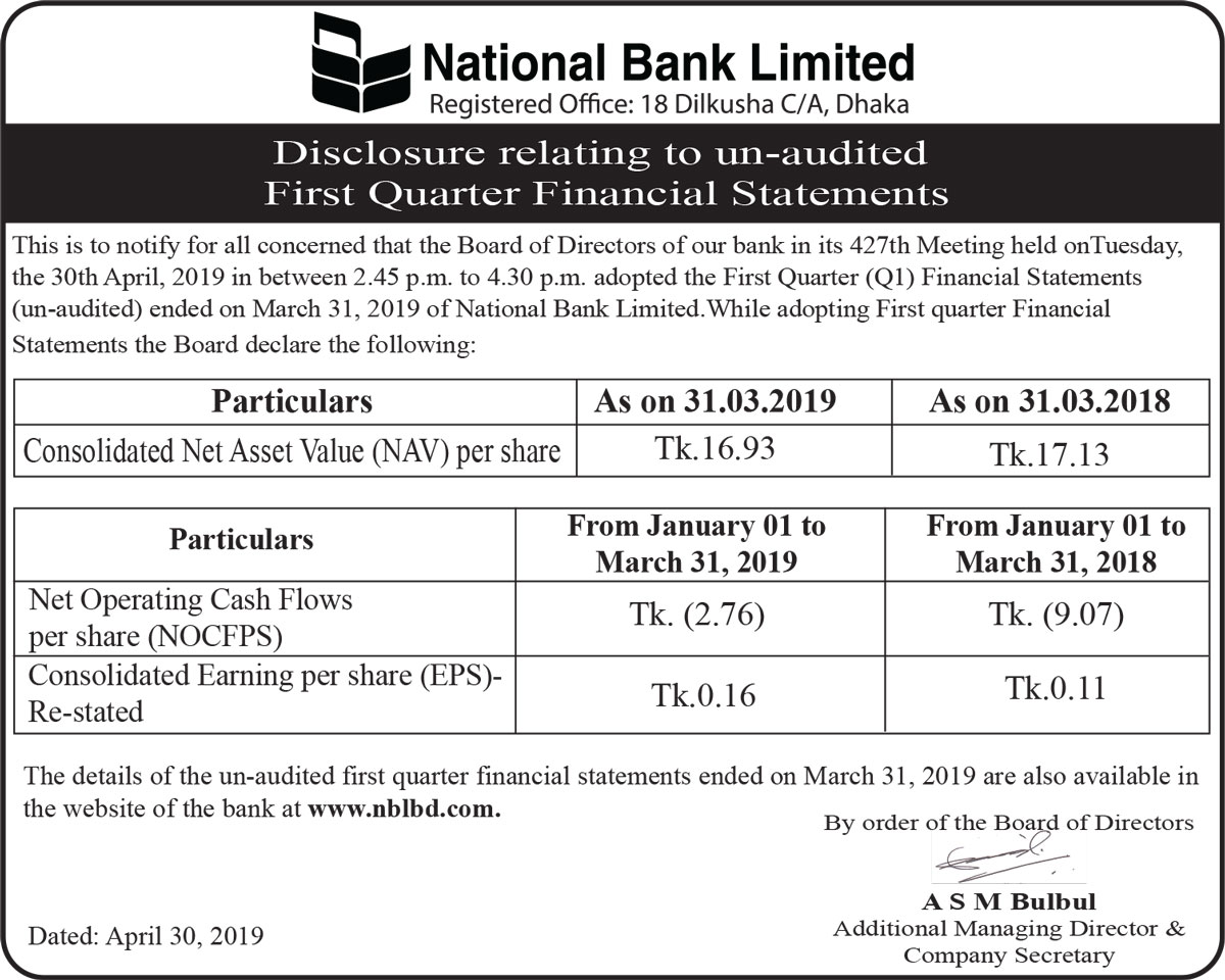 Disclosure Relation to Un-audited Q1 Financial Statements of National Bank Limited
