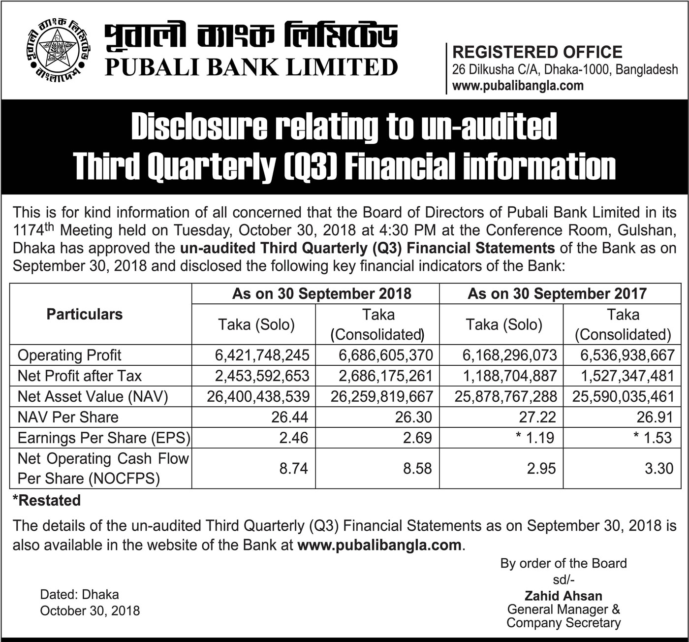 Disclosure Relation to Un-audited Q3 Financial Statements of Pubali Bank