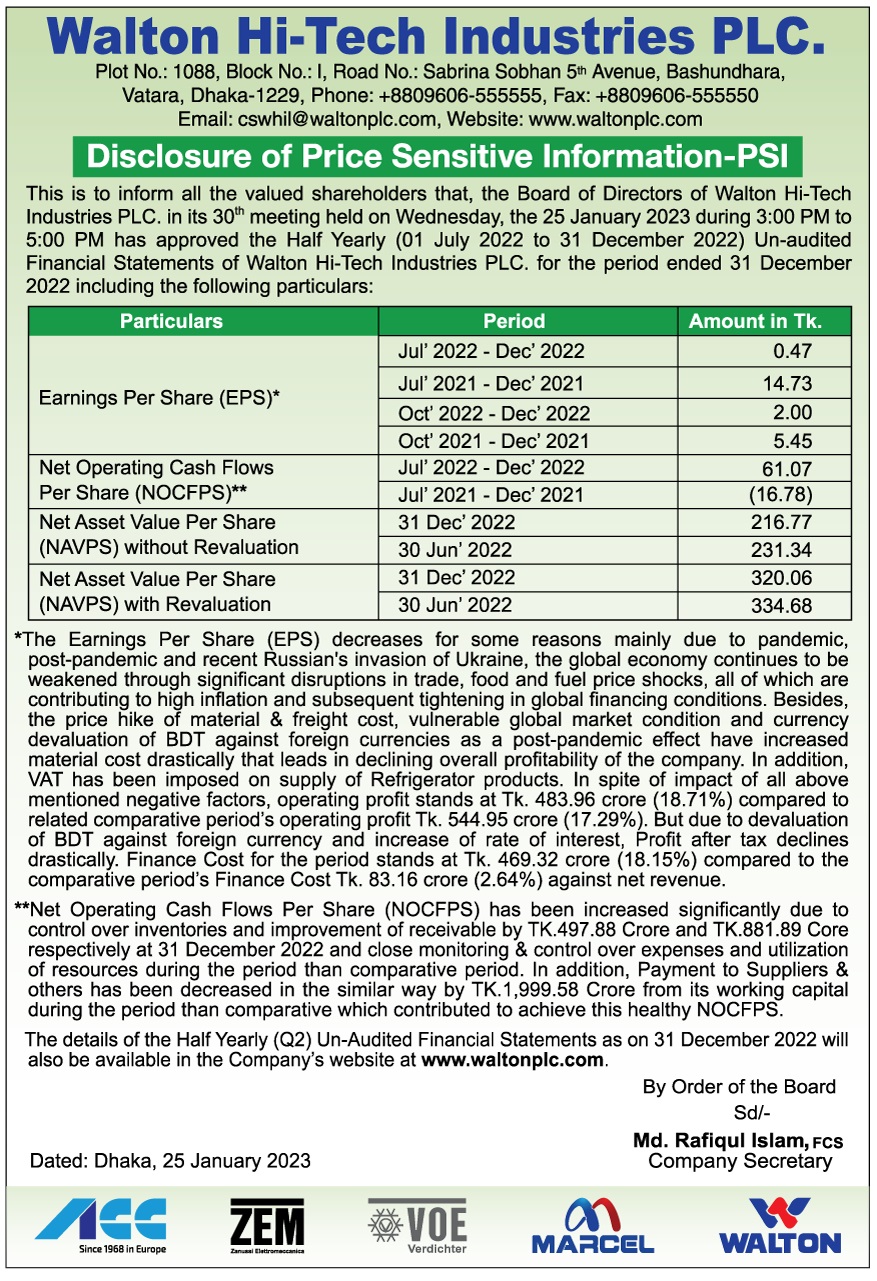 Disclousre of Price Sensitive Information of Walton Hi-Tech Industries PLC