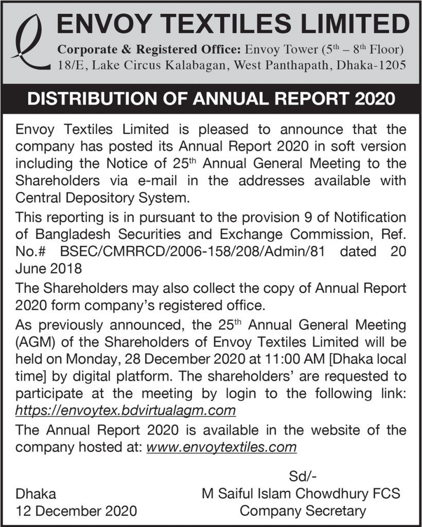 Distribution Of Annual Report 2020 OF Envoy Textiles Limited