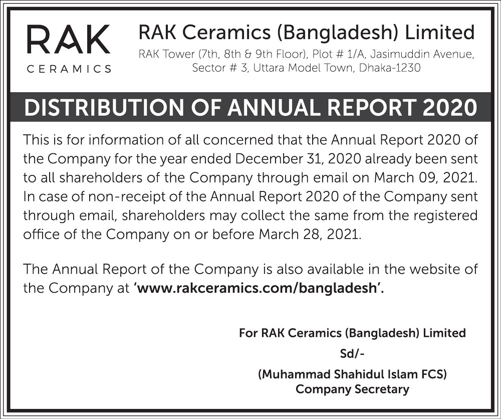 Distribution of Annual Report 2020 of RAK Ceramics (BD) Limited