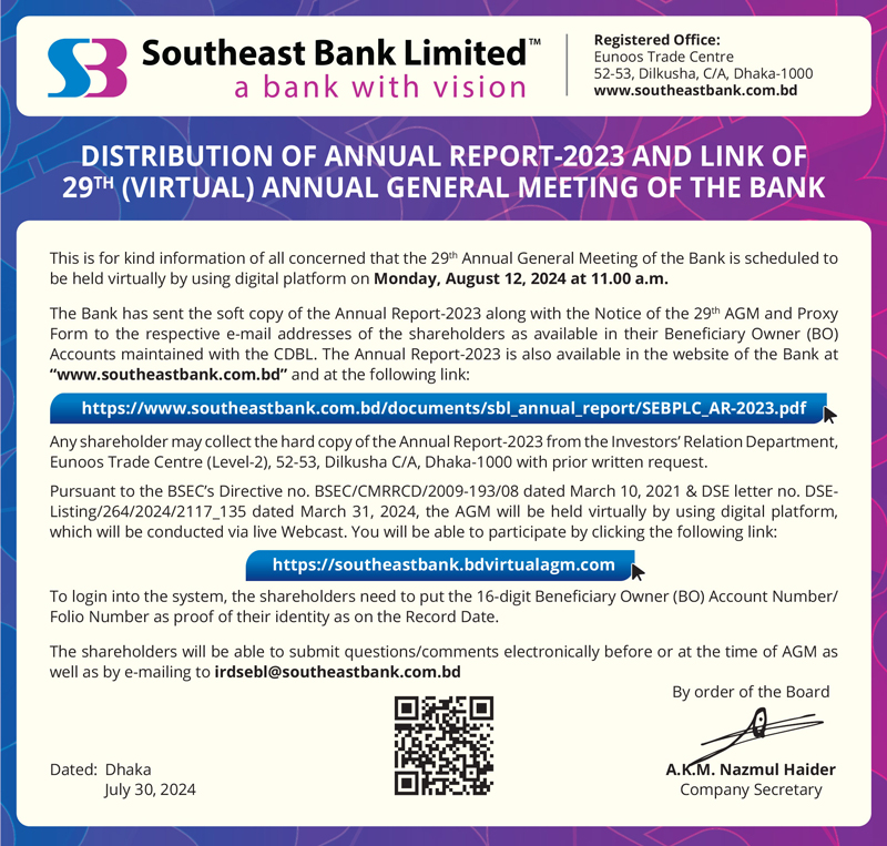 Distribution of Annual Report-2023 and Link of 29th AGM of Southeast Bank Limited