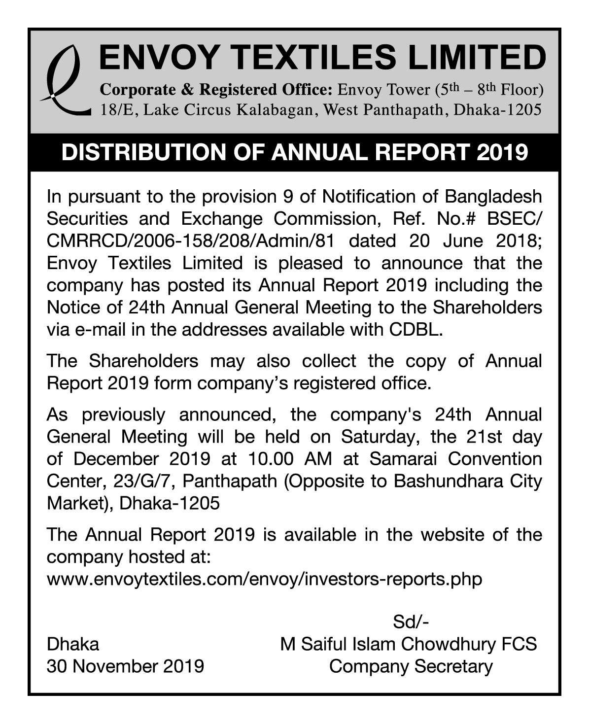 Distribution of Annual Report of Envoy Textiles Ltd.