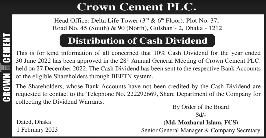 Notic to the Shareholders to claim the Uclaimed Dividend of Crown Cement PLC
