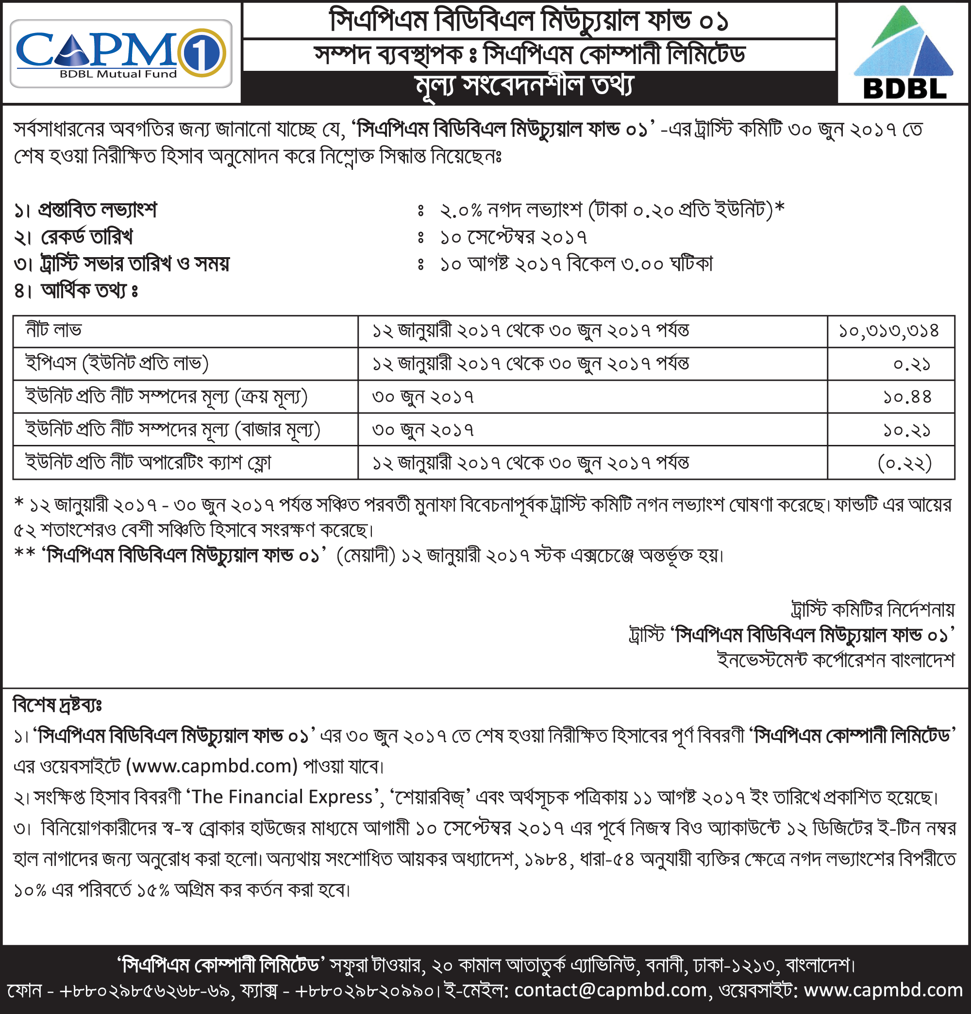 Dividend Declaration of CAPM BDBL Mutual Fund 01