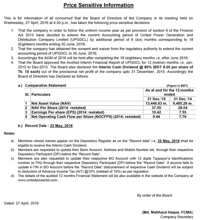1. That the company in order to follow the uniform income year as per provision of section 9 of the Finance Act 2015 have decided to extend the current Accounting period of United Power Generation and Distribution Company Limited (UPGDCL) by additional period of 6 (six) months corresponding to 18 (Eighteen) months ending 30 June, 2016;
