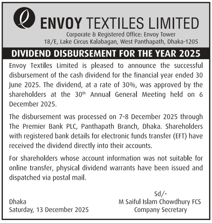 Dividend Disbursement of Envoy Textiles Limited
