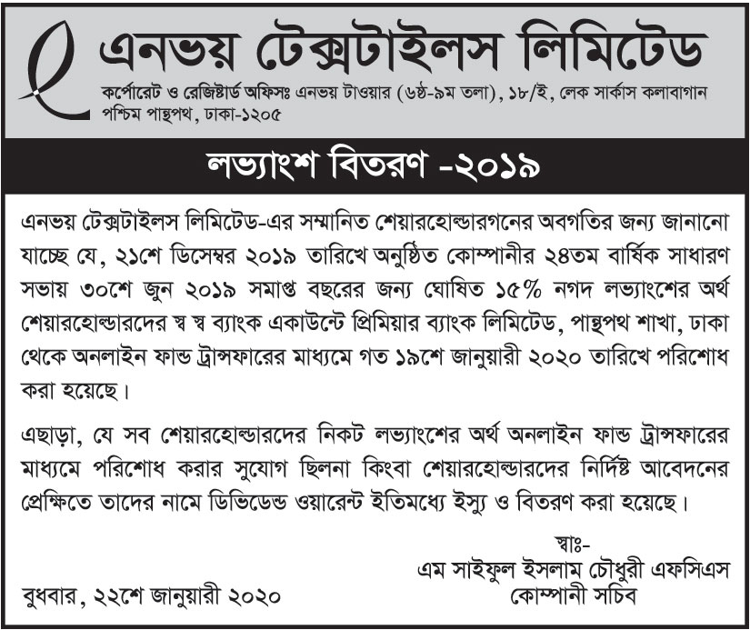 Dividend Notice of Envoy Textiles Limited