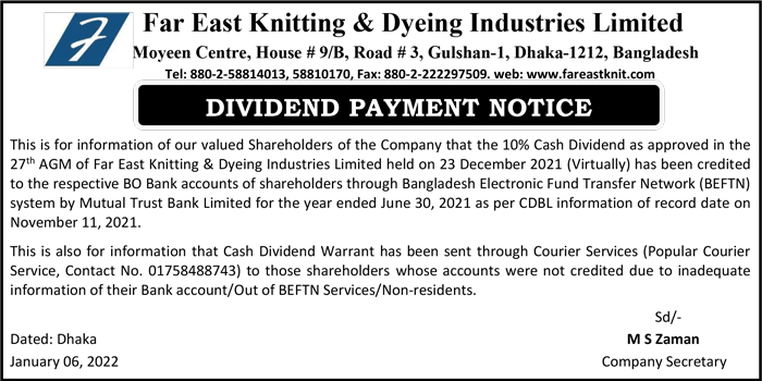 Dividend Payment Notice of Far East Knitting & Dyeing Industries Limited