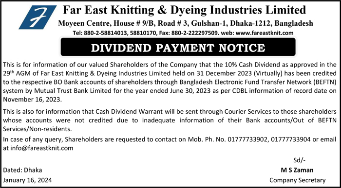 Dividend Payment Notice of Far East Knitting & Dyeing Industries Limited