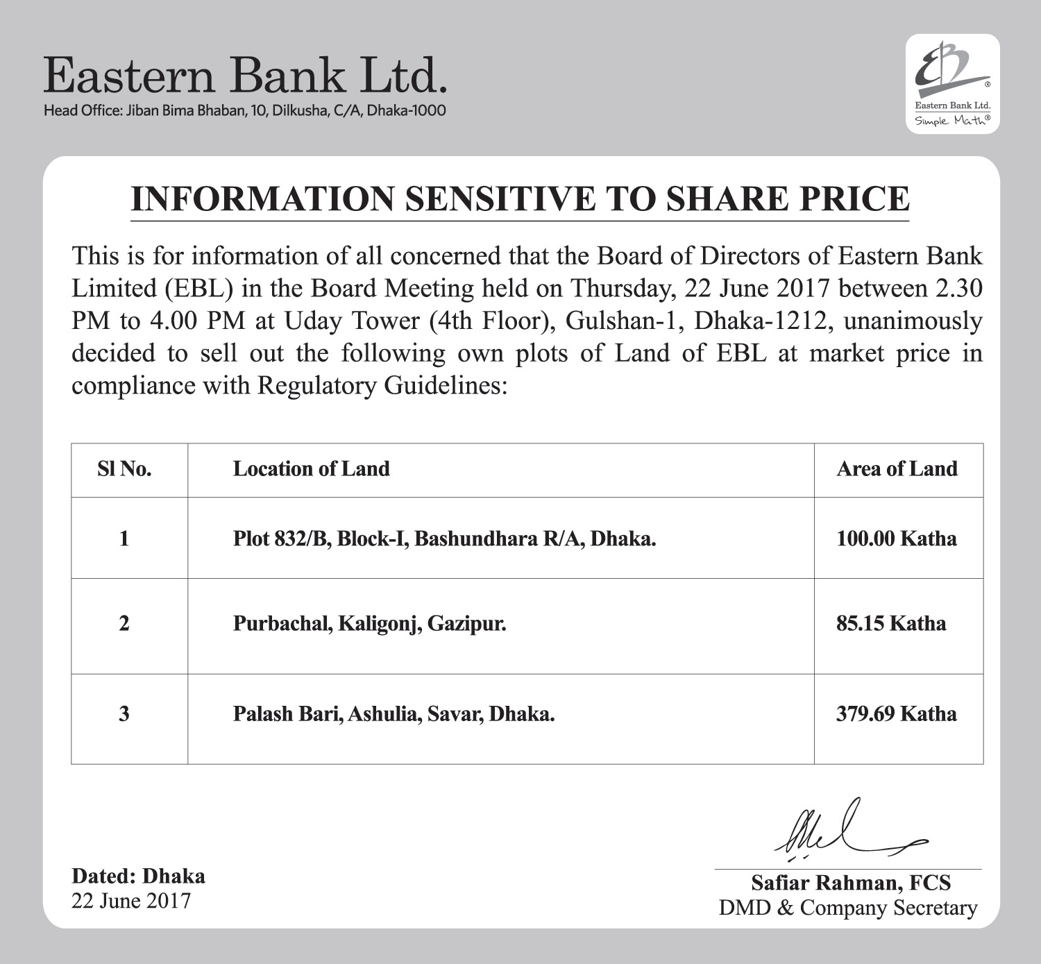 Price Sensitive Information of Eastern Bank Limited