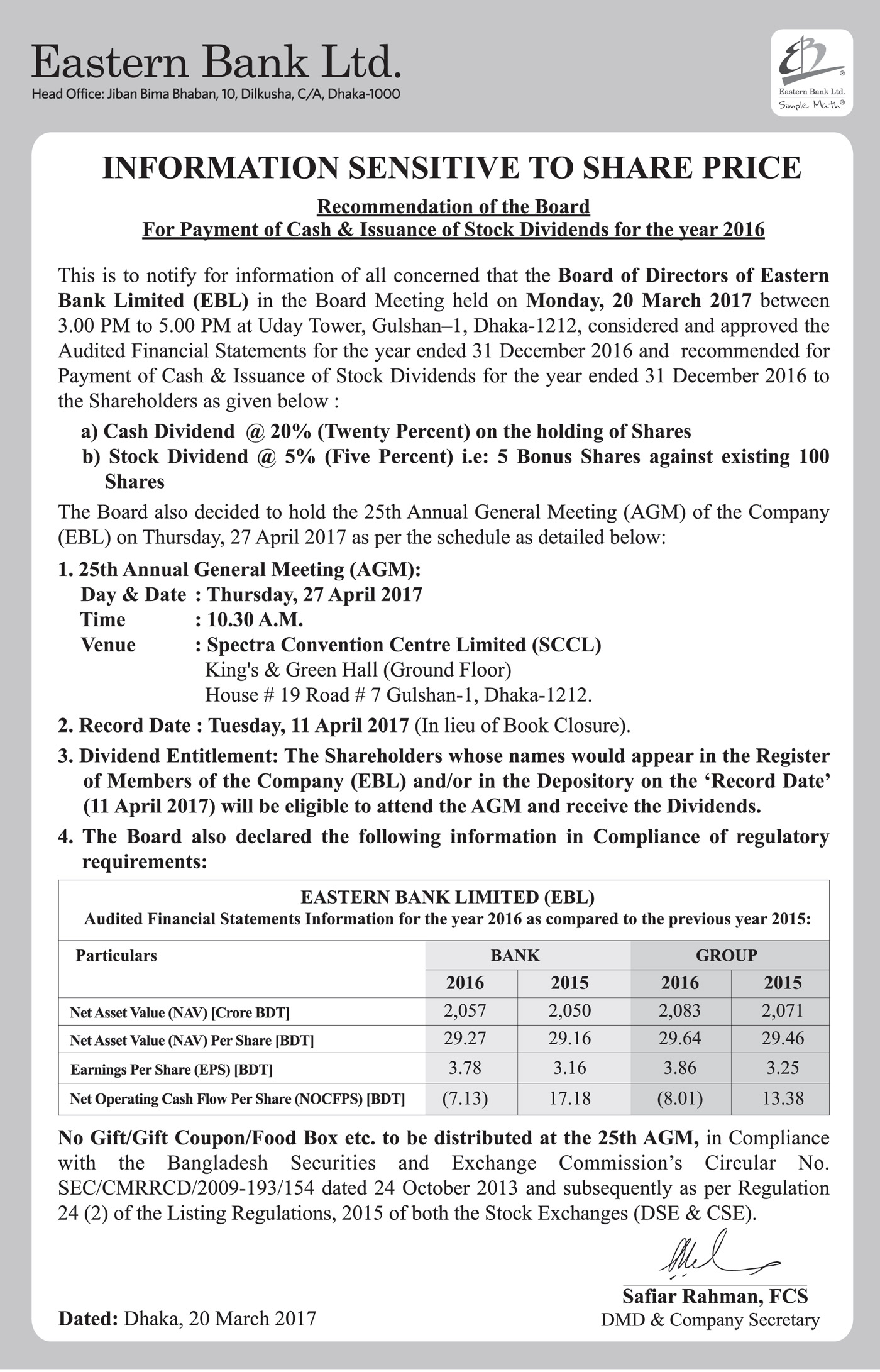 Information Sensitive to Share Price of Eastern Bank Ltd