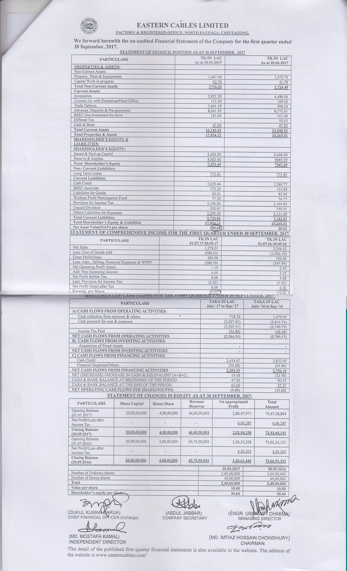 3rd Quarter Financial Statement (Un-audited) of Eastern Cables Limited