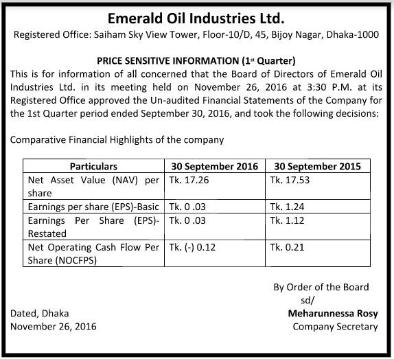 Emerald Oil Industries Ltd 1Q Price Sensitive Information