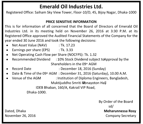 Emerald Oil Industries Ltd Dividend Declare November 2016