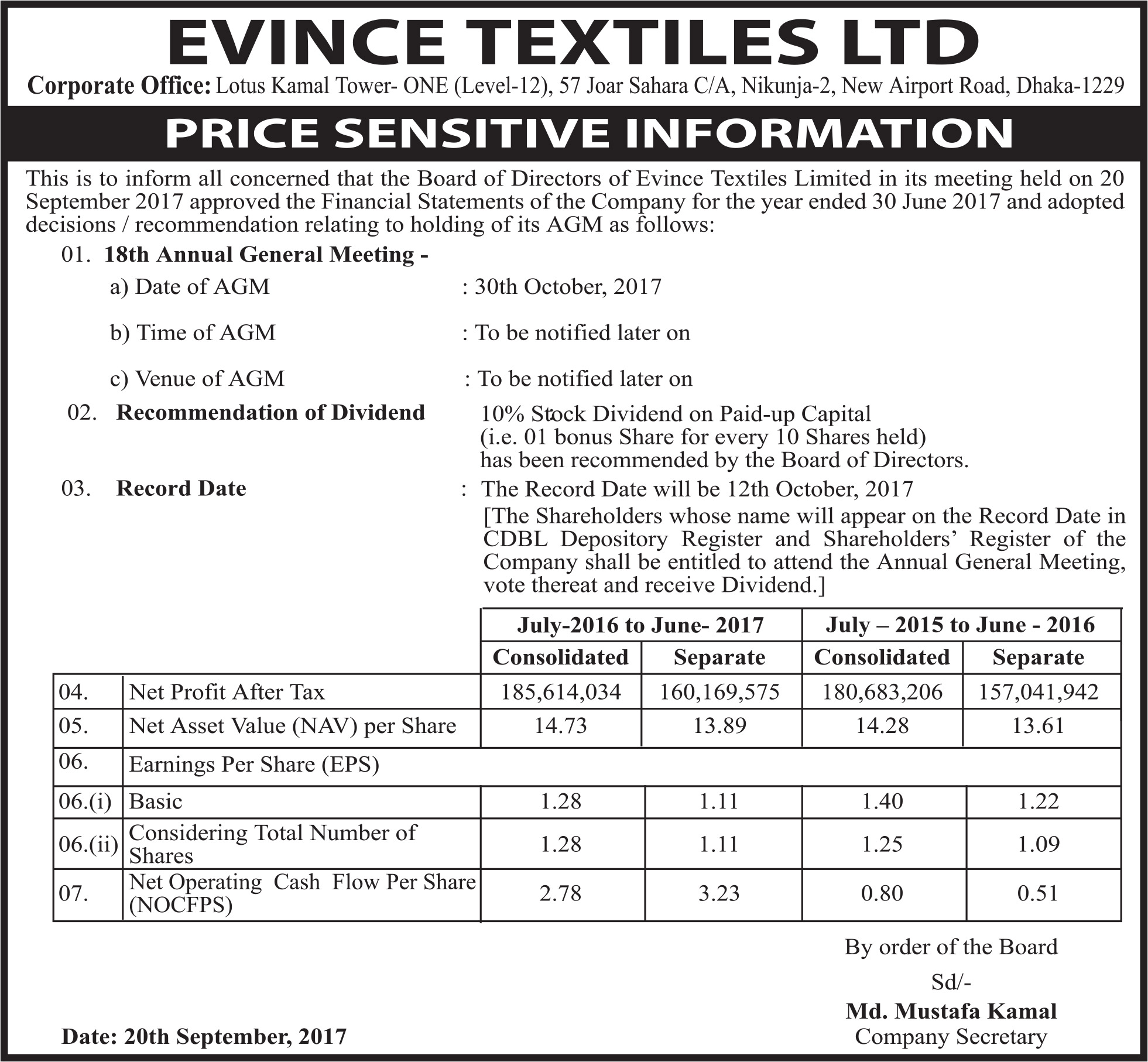 Q2 Un-audited Financial Statements of Evince Textiles Ltd