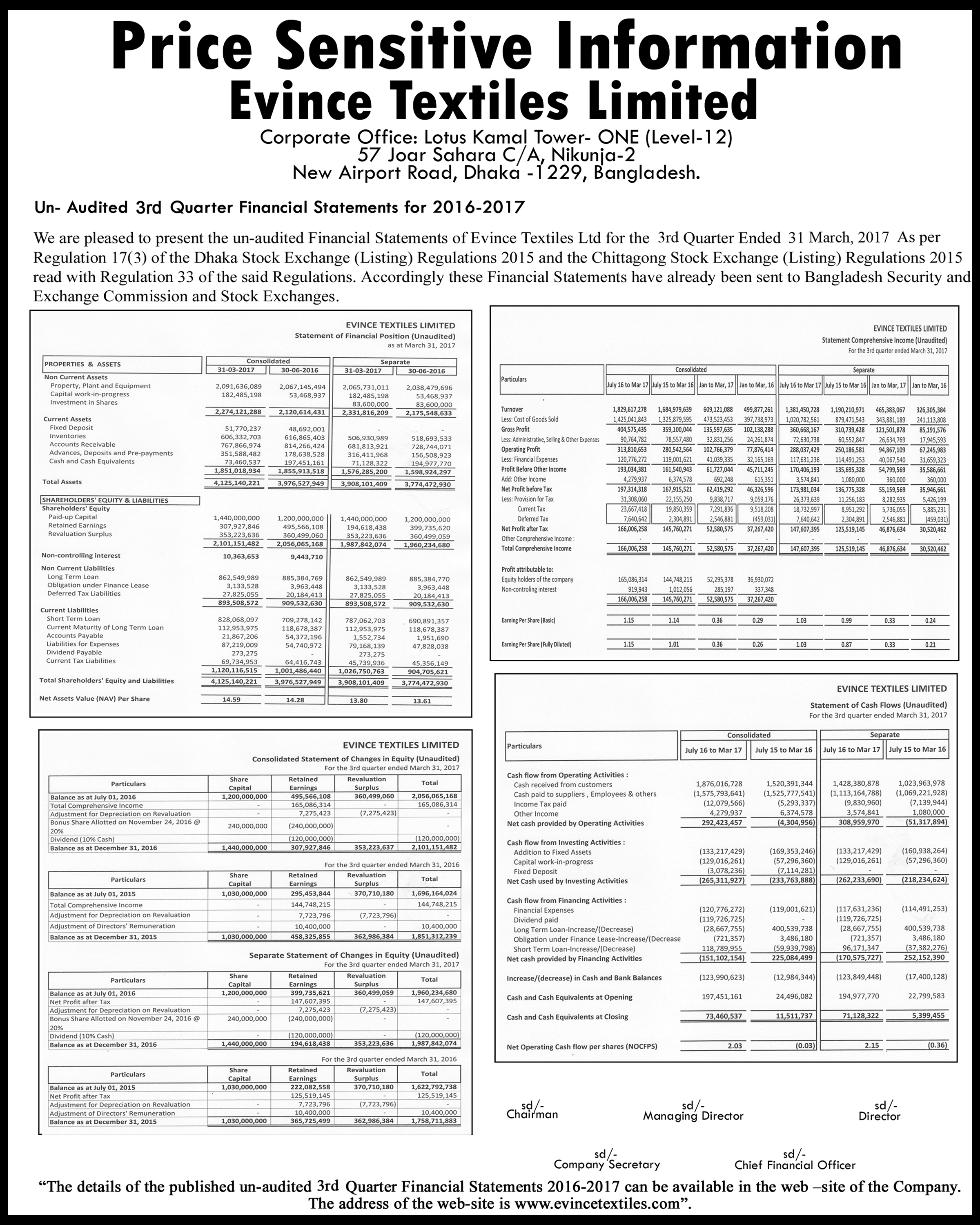 Q2 Un-audited Financial Statements of Evince Textiles Ltd