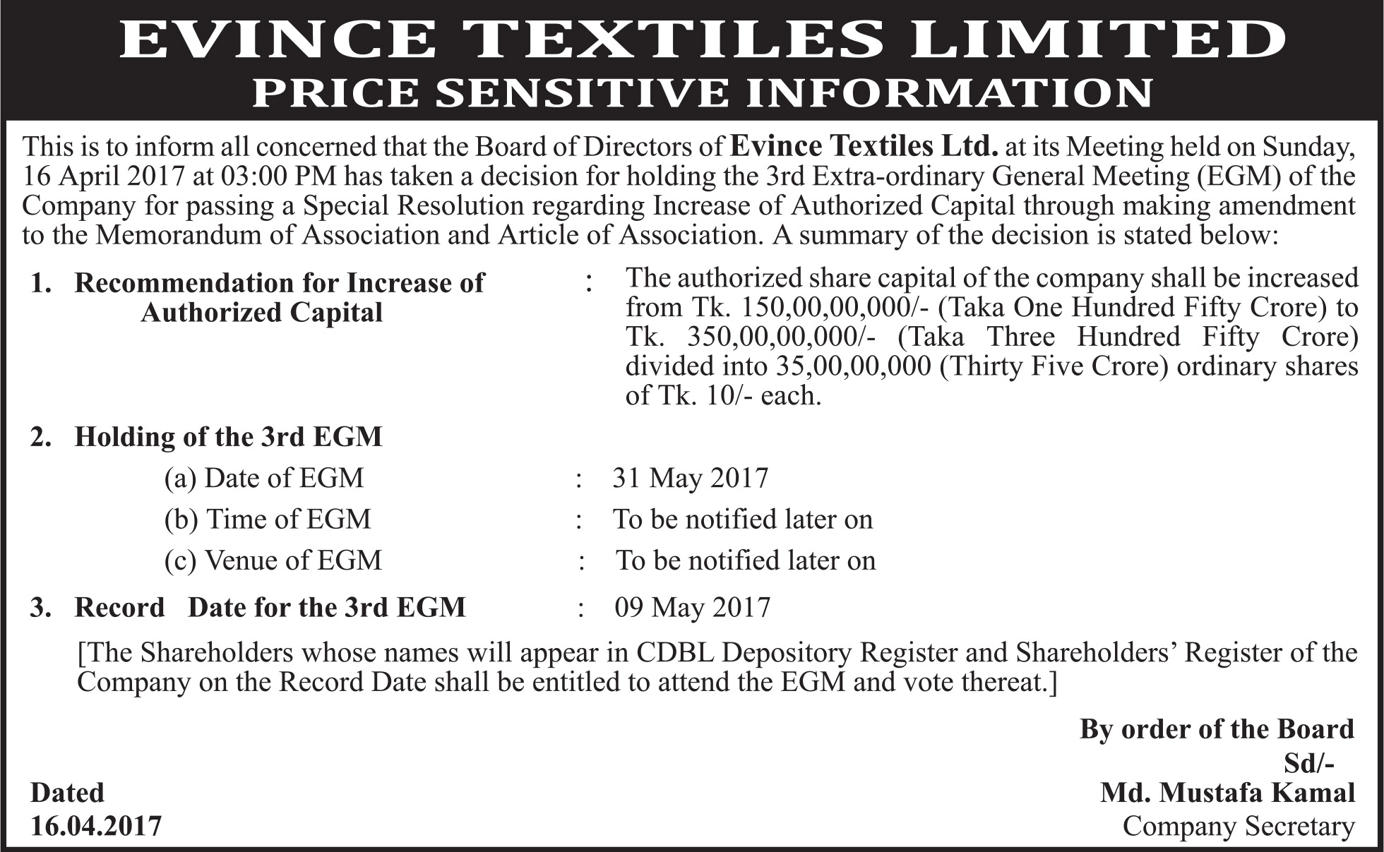 Price Sensitive Information of Evince Textiles Limited