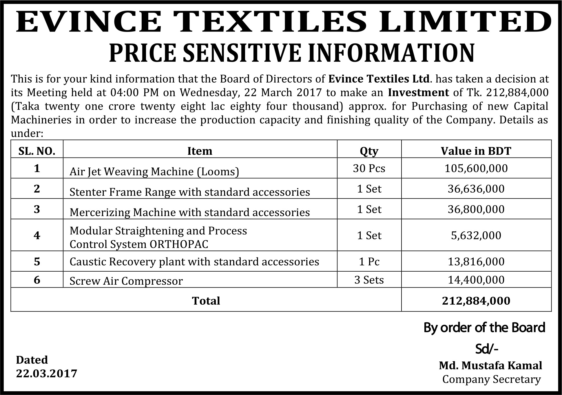 Q2 Un-audited Financial Statements of Evince Textiles Ltd