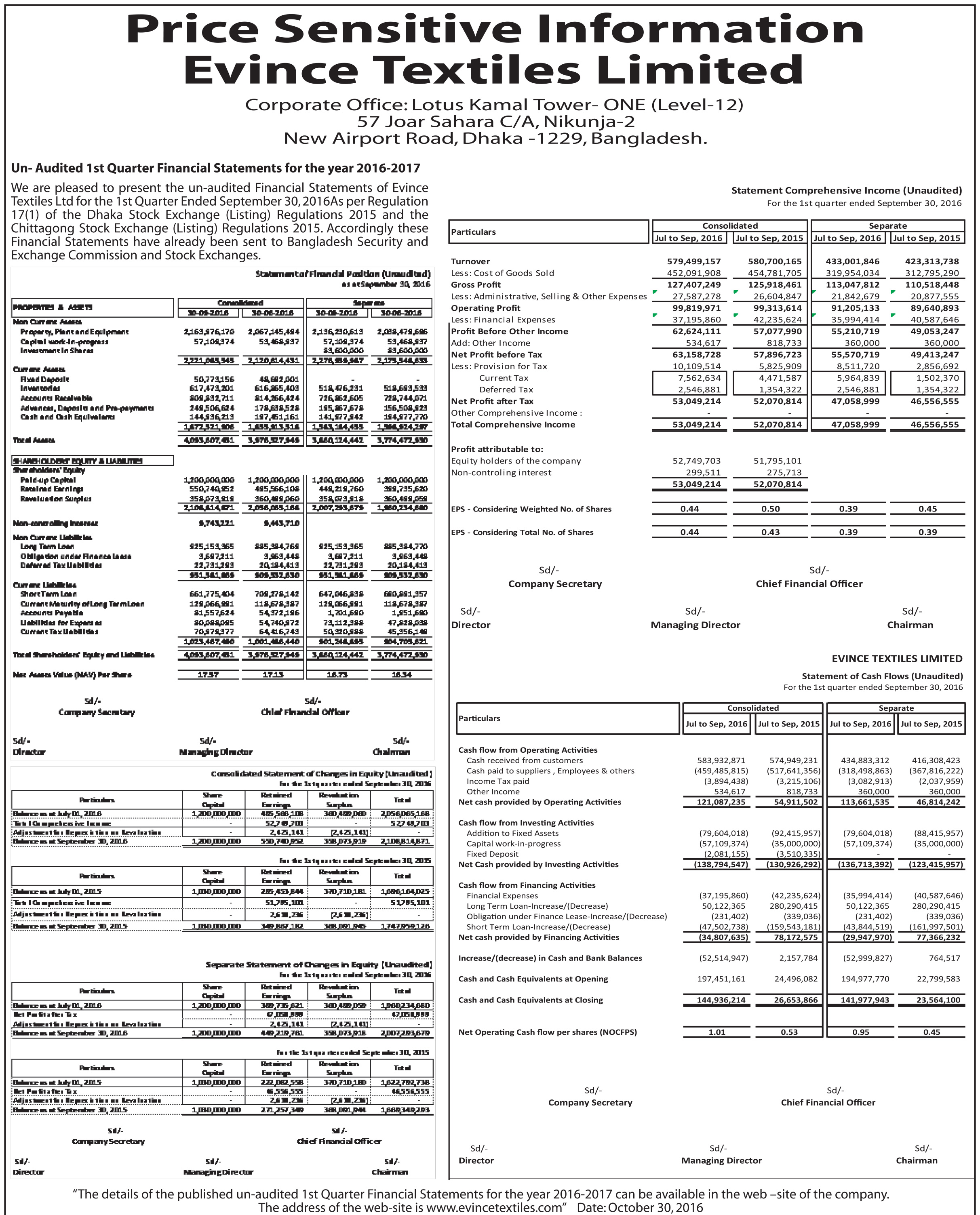 Q2 Un-audited Financial Statements of Evince Textiles Ltd