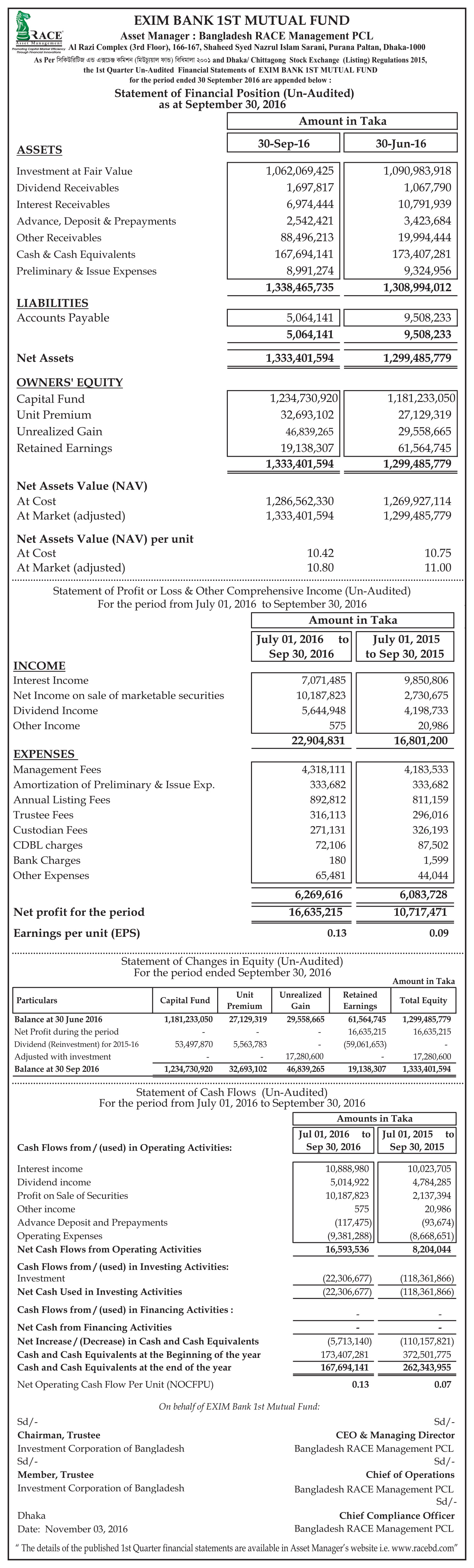 Price Sensitive Information of EXIM Bank 1st Mutual Fund