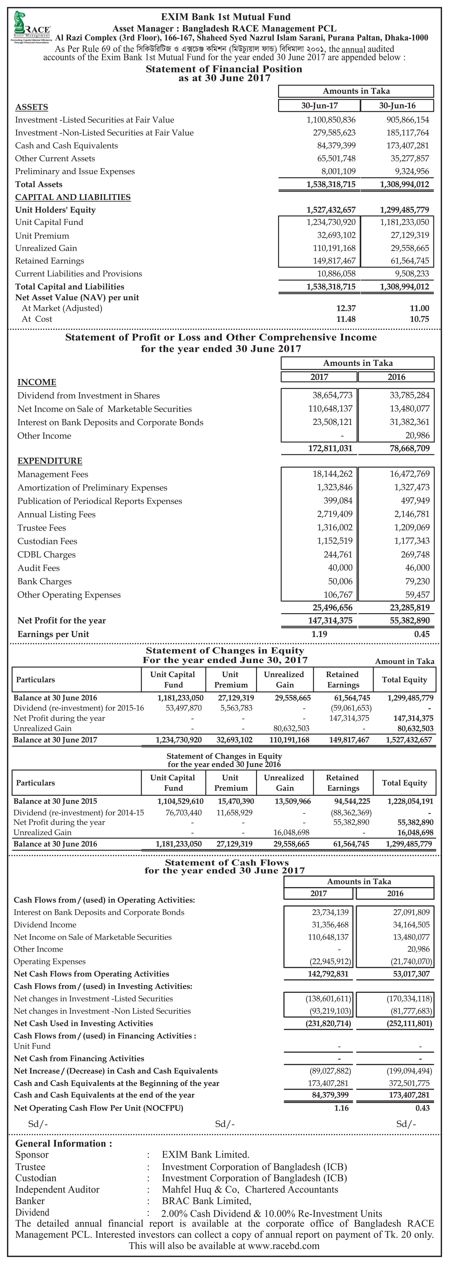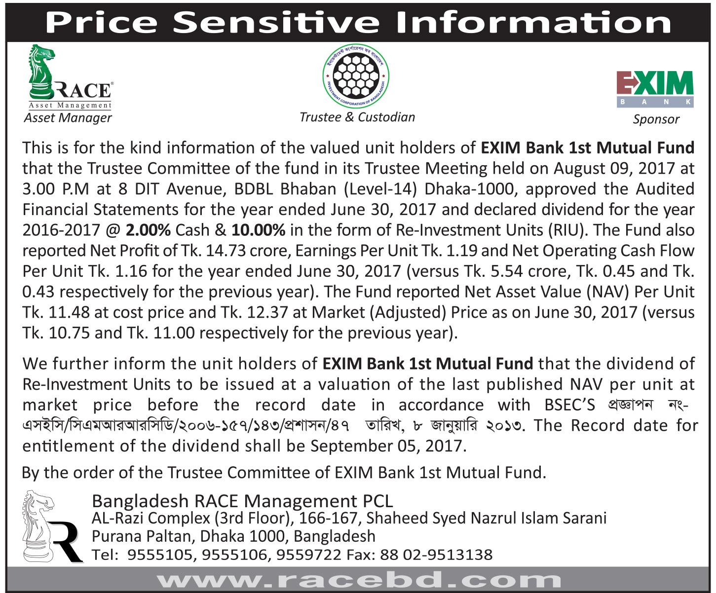 EXIM Bank 1st Mutual Fund Price Sensitive Information
