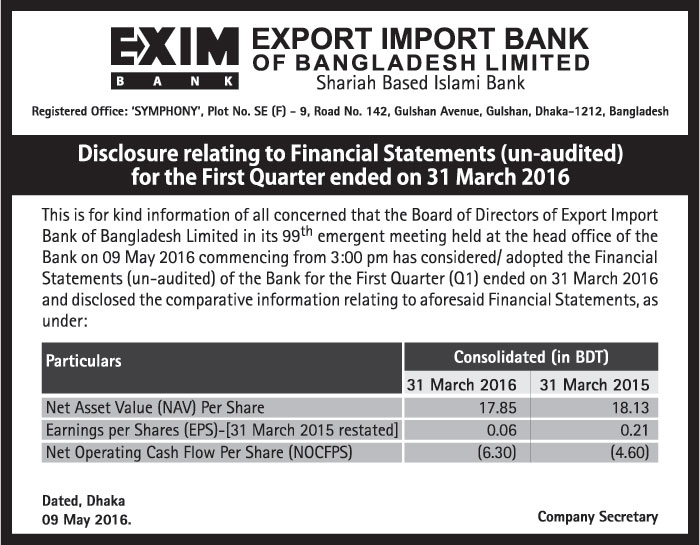 Export Import Bank Of Bangladesh Limited 1Q Price Sensitive Information