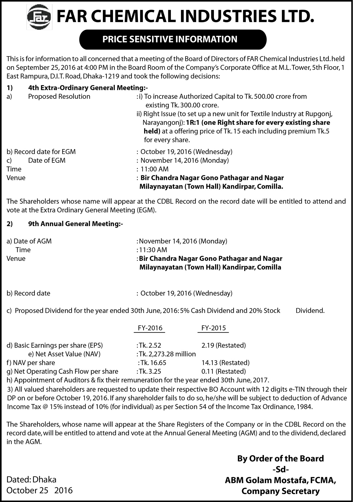 Price Sensitive Information of Far FAR Chemical & Textile Ind. PLC
