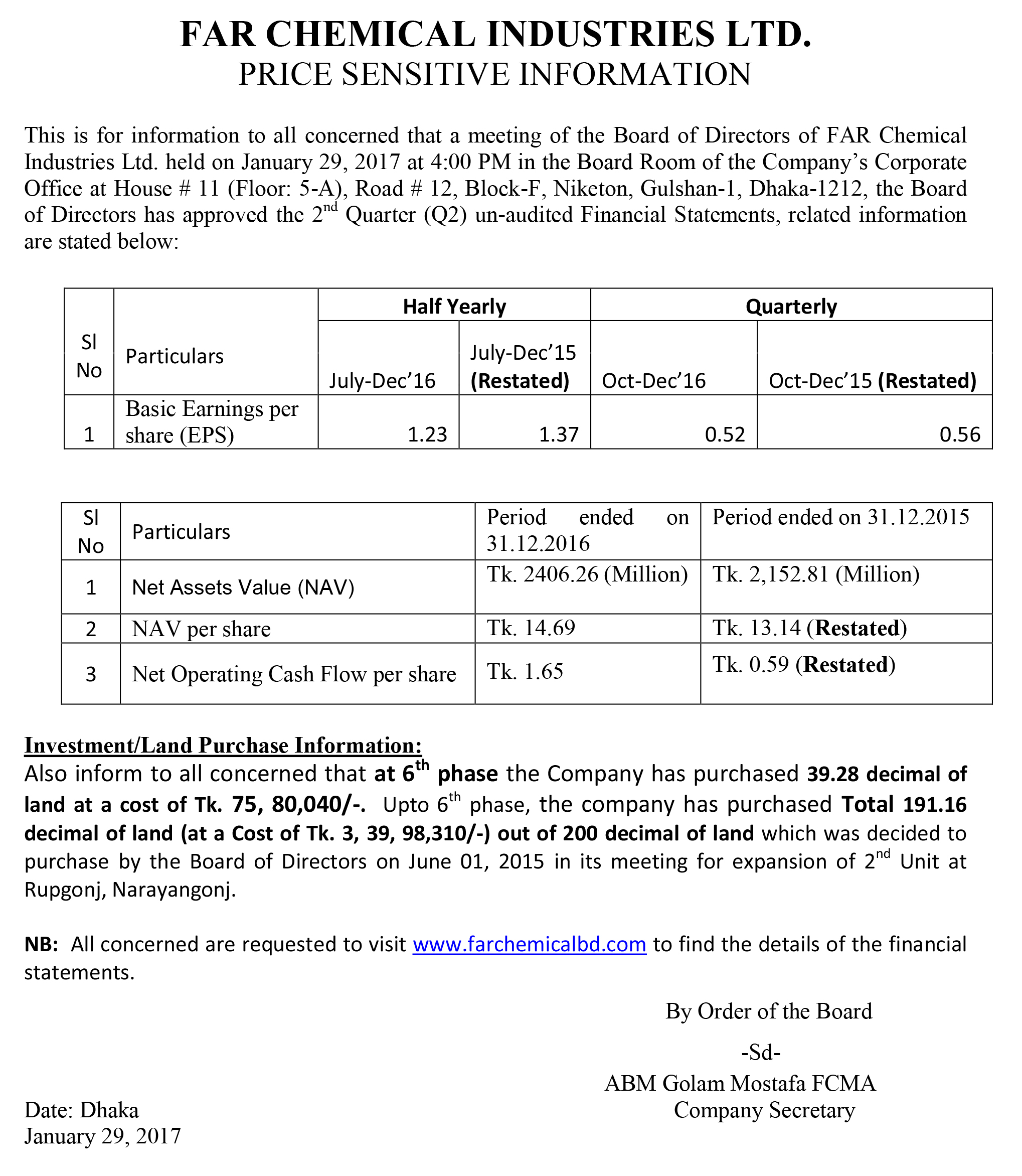 Price Sensitive Information of Far FAR Chemical & Textile Ind. PLC
