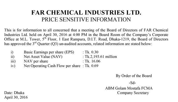 This is for information to all concerned that a meeting of the Board of Directors of FAR Chemical Industries Ltd. held on April 30, 2016 at 4:00 PM in the Board Room of the Company’s Corporate Office at M.L. Tower, 5th Floor, 1 East Rampura, D.I.T. Road, Dhaka-1219, the Board of Directors has approved the 3rd Quarter (Q3) un-audited accounts, related information are stated below: